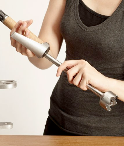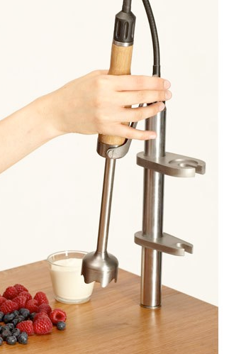 Die im Griff eingebaute Kupplung wird durch den Hebel bedient, welcher auf die Verbindung zu Werkzeugen bewusst in die Gestaltung einbezogen wurde. Heranziehen startet den Mixvorgang, Wegdrücken löst das arretierte Werkzeug.
