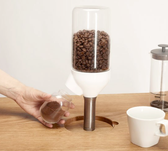 Der Bohnenbehälter besteht wie der Pulverbehälter aus Glas und fasst 300g Kaffeebohnen. Der Korpus aus Porzellan mit Mahlwerk verbindet die beiden Glasbehälter und schließt sie aromadicht ab, um ein möglichst hochwertigen Kaffeegenuss zu ermöglichen.